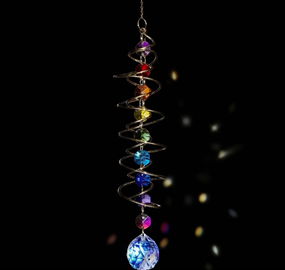 Die goldige Spirale steht für Energiefluss und Unendlichkeit, während die bunten Chakra-Kristalle Körper, Geist und Seele in Einklang bringen. Bei Bewegung oder Licht entfalten sie ein magisches Spiel aus Farben und Glanz – ein Symbol für Balance, Heilung und innere Harmonie.