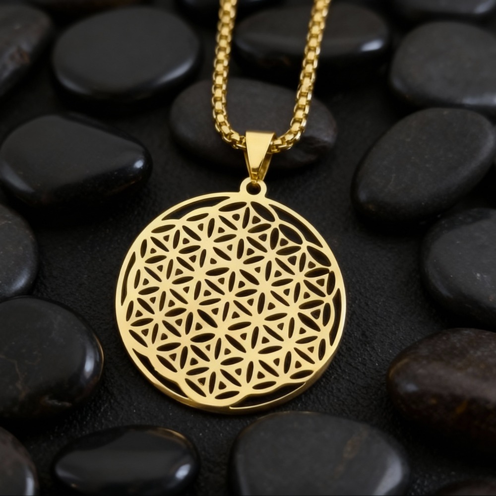 Diese edle Halskette aus goldfarbenem Edelstahl mit einem filigranen Blume des Lebens Anhänger vereint Stil, Symbolkraft und Beständigkeit. Der harmonische Kreis aus feinen Linien steht für Energie, Schutz und die Verbindung allen Lebens. Durch das glänzende Goldfinish erhält die Kette eine warme, luxuriöse Ausstrahlung – ideal für Alltag und besondere Anlässe.