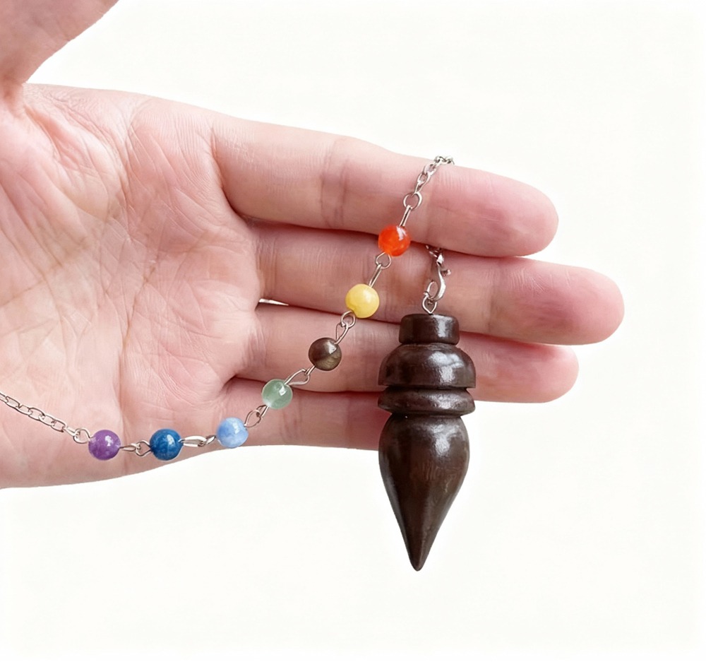 Das Holzpendel steht für Erdung, Natürlichkeit und Stabilität. In Kombination mit den sieben Chakra-Steinen fördert es den freien Energiefluss im Körper und hilft, Blockaden zu lösen. Jede Farbe der Steine repräsentiert eines der sieben Energiezentren – ein Symbol für Harmonie und spirituelles Gleichgewicht.
