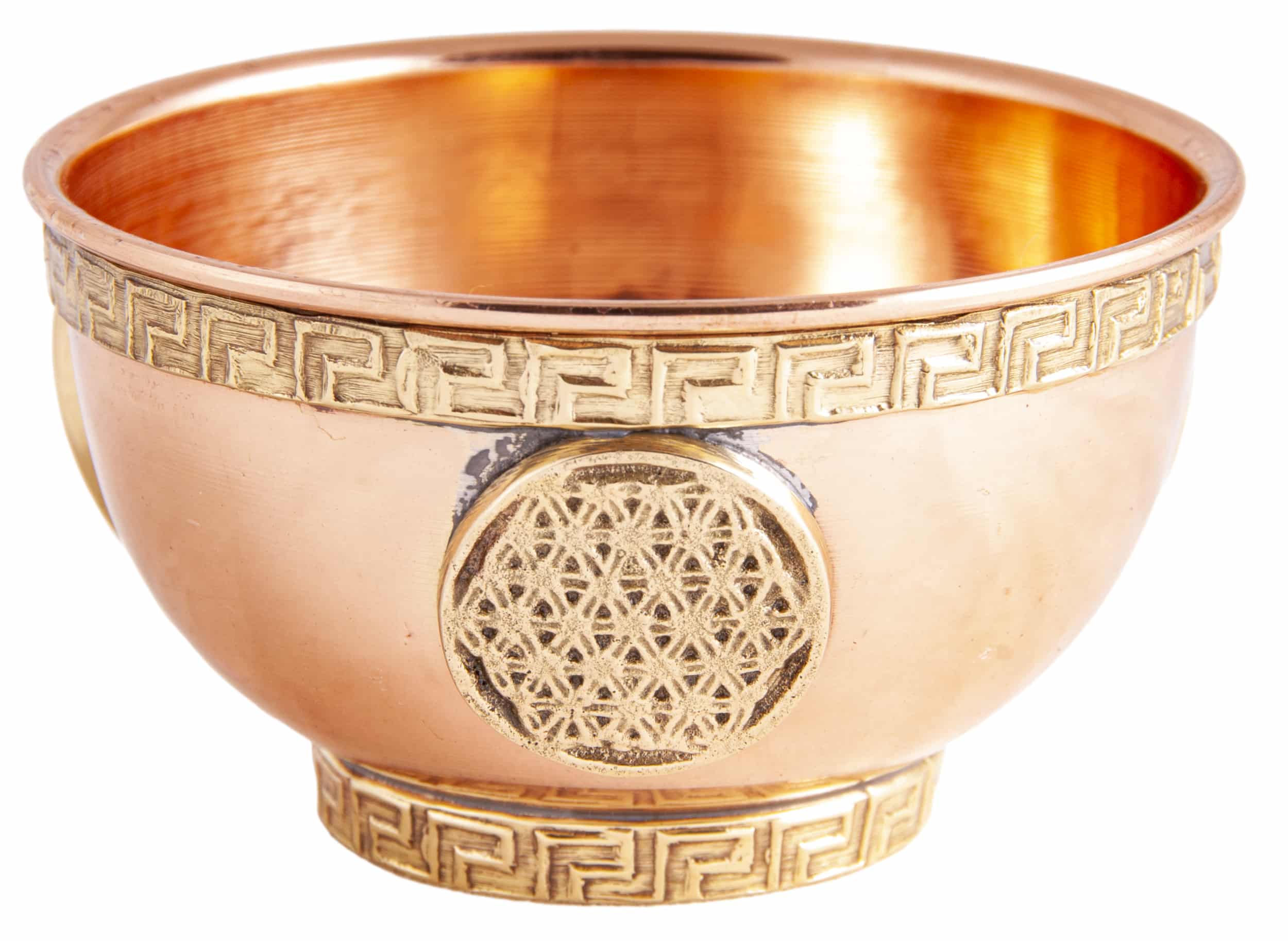 Eine wunderschöne Kupfer Schale mit 3 “Blume des Lebens” Messingmünzen.