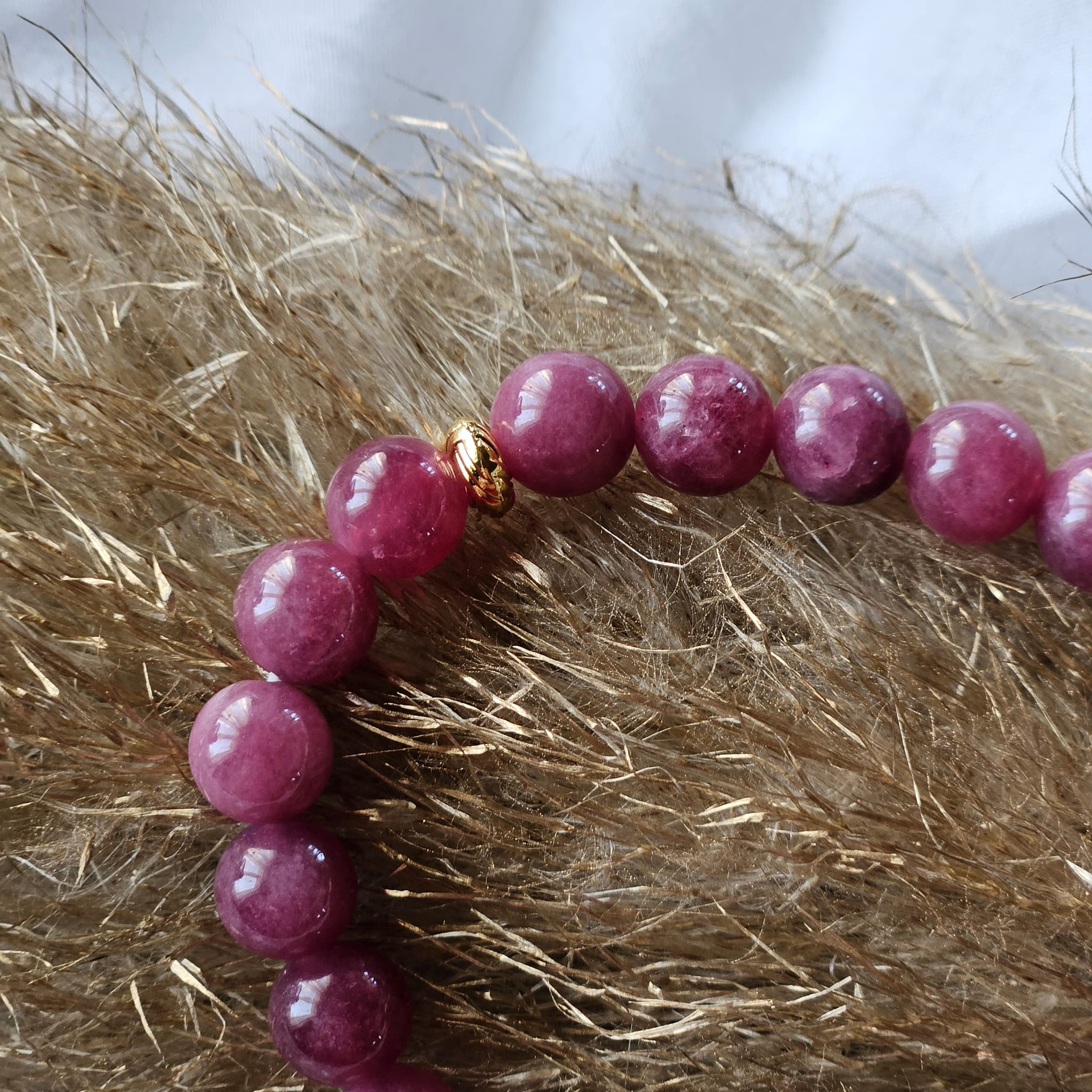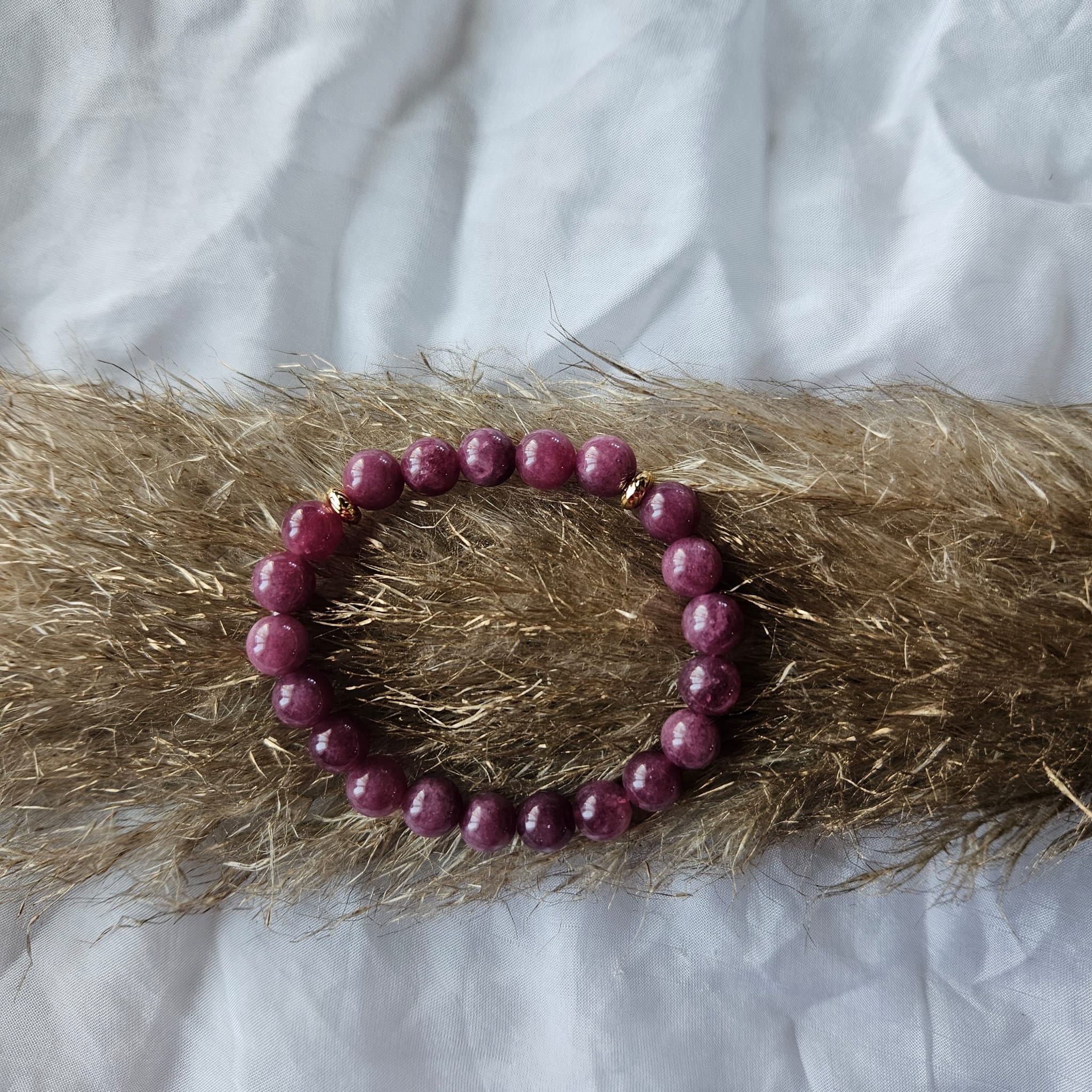 Lass dich von der Magie unseres handgefertigten Lepidolith-Armbands verzaubern – ein Schmuckstück, das nicht nur dein Handgelenk, sondern auch deine Seele berührt! Die zartviolett schimmernden Lepidolith-Perlen strahlen eine beruhigende Energie aus und werden mit zwei edlen Ringen aus 18-Karat-Gold zu einem echten Hingucker. Das warme Gold schenkt dir einen Hauch von Luxus und macht dieses Armband perfekt für jeden Moment deines Tages.